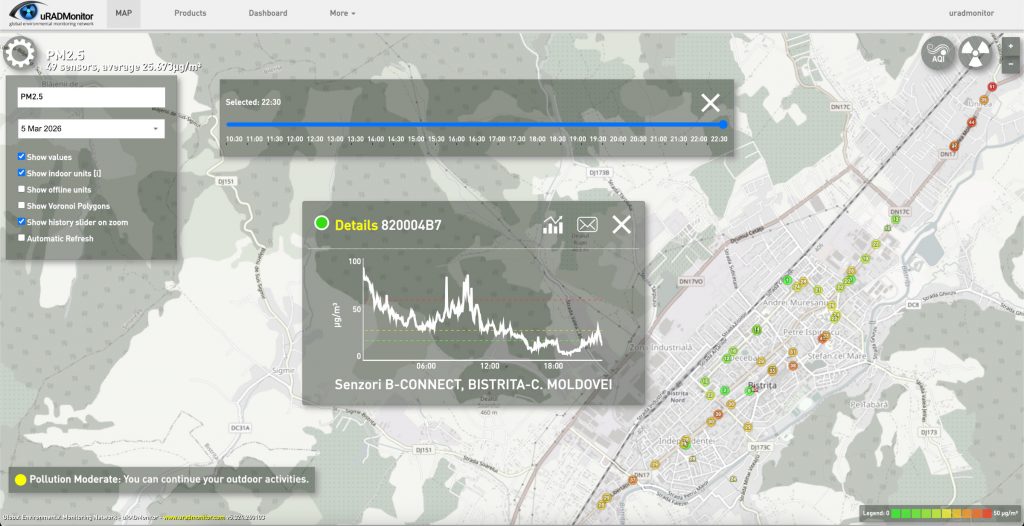 În 2021, orașul Bistrița a făcut un pas important spre sustenabilitate ecologică prin instalarea a 18 senzori multi-parametru uRADMonitor ca parte a inițiativei “Zero Carbon City”” Proiectul s-a concentrat pe monitorizarea nivelurilor de CO2 pentru reducerea amprentei de carbon pe termen lung, urmărirea parametrilor de calitate a aerului precum particule în suspensie (PM), compuși organici volatili (VOC), formaldehidă, ozon și zgomot pentru evaluarea impactului asupra sănătății, crearea unei hărți la nivel de oraș a zgomotului, estimarea modelelor de trafic și promovarea comportamentelor sustenabile. Senzorii, inclusiv modelele uRADMonitor® MODEL A3 și SMOGGIE®-CO2, au fost plasați în zone cu trafic intens și școli precum Grădinița Nr. 10 și Colegiul Liviu Rebreanu. Rezultatele au arătat insights în timp real: nivelurile de CO2 creșteau în orele de școală, dar scădeau cu ventilarea; zgomotul scădea în vacanțe datorită traficului redus; calitatea aerului s-a îmbunătățit, crescând funcția cognitivă în clase și permițând avertizări privind poluarea pentru grupurile vulnerabile. Acest efort a stimulat educația comunitară și acțiuni individuale privind transportul și consumul de energie, punând bazele unui trai urban mai verde. Pentru mai multe detalii, vizitați pagina proiectului din 2021.